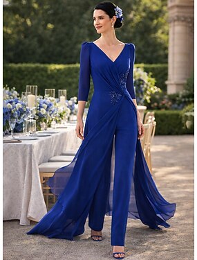 Tuta Completo da cerimonia abito madre della sposa elegante scollo a V lungo fino al pavimento in chiffon a maniche corte con volant e drappeggio laterale