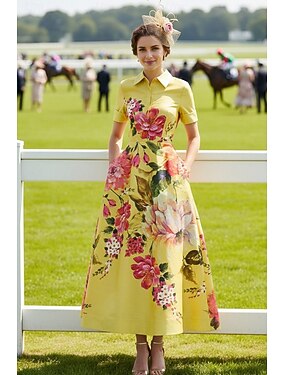 Linea ad A Lunghezza alla caviglia Lunghezza Tè Abito Derby Abito da cerimonia per signora Senza Maniche Scollo a V Collo Alto Elegante Vintage Derby del Kentucky Raso con Fiore Stampa