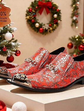 scarpe eleganti da uomo in pelle mimetica rossa: design audace con dettagli dorati, ideali per feste di Natale e occasioni speciali