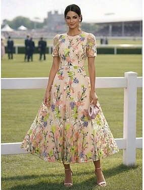 Linea ad A Lunghezza Tè Abiti da Cocktail Elegante Vintage Floreale Manica Corta Girocollo Festa in giardino Matrimonio Raso Tulle Shiena scoperta con Fiore ricamato Pieghe Ricamo