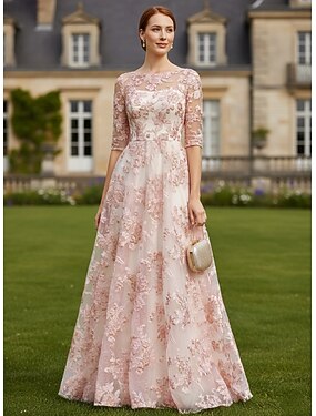 Linea ad A Lunghezza al pavimento Abito da cerimonia per signora Mezza Manica Scollo Illusione Scollo Tondo Elegante Vintage Formale Ospite di nozze Serata Formale Chiffon Organza Jacquard con Fiore