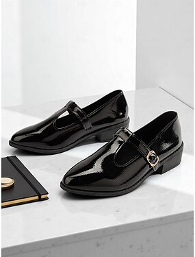 Scarpe Mary Jane da donna in vernice nera con cinturino a T – scarpe basse a punta e blocco per ufficio, scuola ed eventi semi-formali
