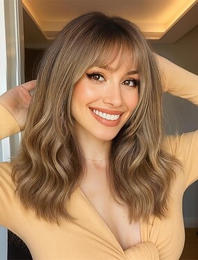 Parrucca da donna di media lunghezza, color castano ramato, ondulata con frangia, naturale e soffice, ideale per l'uso quotidiano, feste e cosplay.