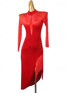 abito da ballo latino da donna in velluto rosso - abito da spettacolo con maniche lunghe, collo finto in rete, frange e orlo asimmetrico