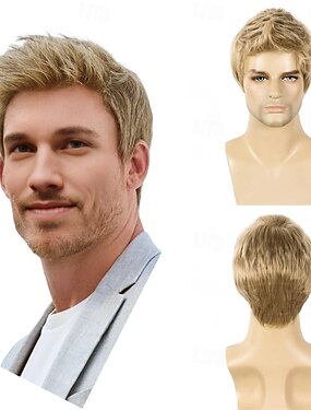 Parrucca bionda da uomo, corta, liscia, in capelli sintetici biondi, per uso quotidiano, costume anime, Halloween, cosplay e feste (adatta a circonferenze della testa di 21-22,5 pollici).
