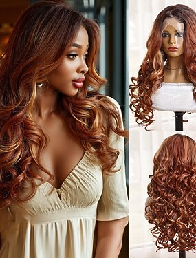 Parrucca in pizzo sintetico Ondulato naturale Stile 30 pollice Marrone con riflessi dorati Riga centrale 13x4 Fronte in Pizzo Parrucca Per donna Parrucca Bianco crema