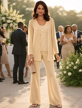 Tuta Completo Pantalone Tre Pezzi Lunghezza al pavimento Abito da cerimonia per signora Senza Maniche Scollo a V Elegante Lussuoso Formale Ospite di nozze Chiffon Pizzo Con Stola con Perline