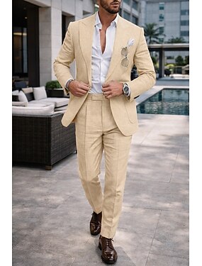 Uomo Smoking Completi in Lino Matrimonio in Spiaggia Matrimonio Beige Primavera, Autunno, Inverno, Estate Tuta Bavero classico Leggero Casual Tinta unita Vestibilità standard 2 pezzi Monopetto Due