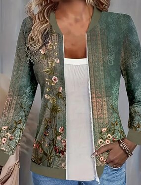 Per donna Giacca Casual Confortevole Cerniera Stampato Casual Fiore All'aperto Streetwear Ferie Abbigliamento quotidiano Cerniera Regolare Girocollo Vestibilità regolare Manica Lunga Capispalla Verde