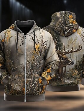Felpa con cappuccio da uomo con cerniera, grafica realistica di cervo maschio, felpa da caccia, autunno, foresta, fauna selvatica, giacca con cappuccio, abbigliamento marrone, abbigliamento s m l xl
