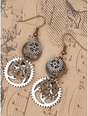 Orecchini a pendente in lega antica a forma di ingranaggio e chiave da Mardi Gras per donna - Accessorio industriale multicolore per carnevale e feste a tema