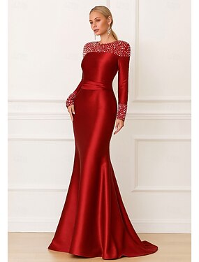 Sirena Tromba Lunghezza al pavimento Abiti da Ballo Abito da Sera Da principessa Abito formale Elegante Brillanti Manica Lunga Girocollo Matrimonio Formale Raso Elasticizzato con Perle