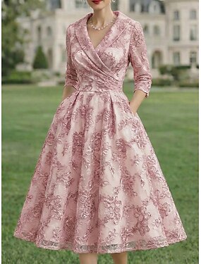 Linea ad A Abito Lunghezza alla caviglia Lunghezza Tè Abito da Cocktail Abito da cerimonia per signora Manica 3/4 Scollo a V Bavero Elegante Lussuoso Casual Formale Ospite di nozze Semi-Formale Pizzo