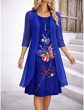 Giorno dell'Indipendenza Set Vestito Donne Patriottico Vestito A-Line Elegante Vacanza Grafica Bandiera Stampa Strati Vestito Midi Maniche Half Collo Rotondo Quotidiano Blu Estate Primavera Fit