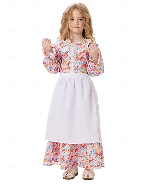 250° anniversario USA Periodo coloniale 19° secolo Abito da prateria Set cuffia e grembiule Lunghe Ragazza pioniera Coloniale Guerra rivoluzionaria Floreale Costume Ragazze Halloween Carnevale