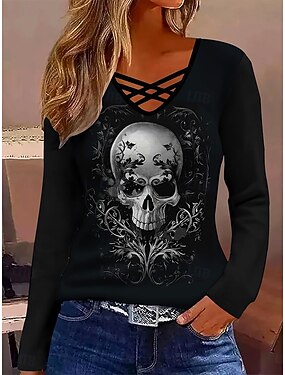 T-Shirt Donna Stampa Teschi Grafica Vintage Elegante Classico Maniche Lunghe Collo a V Top Regolari Stampa Giornaliera Fiocco Frangia Nera Autunno Inverno