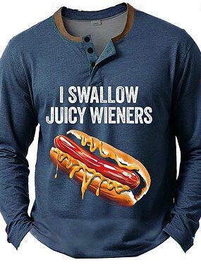 T-Shirt Henley a Manica Lunga per Uomini Umoristico 'Ingurgito Salsicce Succulente' Gioco di Parole Hot Dog Grafica
