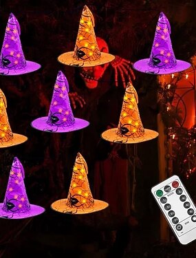 8 pezzi di decorazioni di Halloween luminose da appendere al cappello da strega per interni ed esterni, luci sospese con telecomando, alimentate a batteria, 8 modalità di illuminazione, adatte per