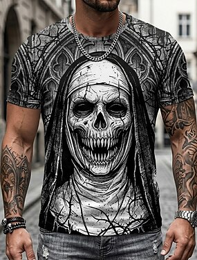 Maglietta da uomo con stampa integrale di teschio malvagio, suora, cattedrale gotica, horror, dark, macabro, metal, vestibilità regolare, streetwear, Halloween, festa, abbigliamento firmato, taglie S,