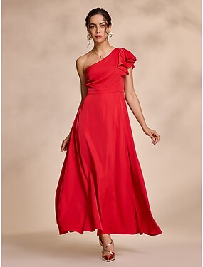 abito lungo in raso rosso con orlo a peplo, solido, per feste/invitati a nozze, per stupire 2024