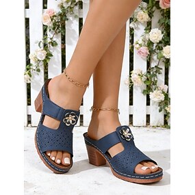 sandali da donna blu navy traspiranti con tacco a blocco e dettagli floreali - scarpe con tacco aperte, casual e comode per lavoro, ufficio, viaggi, shopping &abbigliamento quotidiano