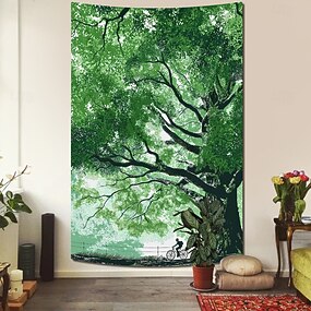 natura foresta sereno grande albero verde ciclista bicipenne pista ciclabile arazzo da parete paesaggio arte decorazione da appendere per soggiorno camera da letto ufficio estetica zen casa