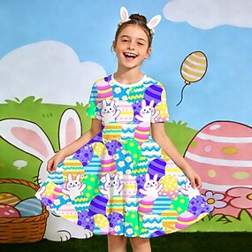 Pasqua ragazze' 3D Grafico Coniglio Abito Manica Corta Stampa 3D Estate Primavera Quotidiano Vacanza Feste Carino Essenziale Casual Bambini 4-12 Anni Vestito Casual Abito a trapezio Lunghezza al