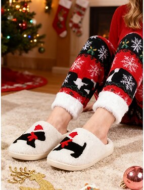 pantofole natalizie bianche da donna a forma di cane con design a cappello di Babbo Natale: comode pantofole pelose per il comfort invernale, la mattina di Natale e il relax delle vacanze