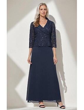 Linea ad A Lunghezza al pavimento Vestito da Festa Abito da Cocktail Abito da invitata a nozze Abito da cerimonia per signora Manica 3/4 Scollo a V Elegante Semplice Minimalista Formale Ospite di