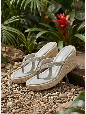 Eleganti sandali con zeppa da donna color grigio chiaro - cinturini infradito con strass scintillanti e plateau in espadrillas intrecciata, perfetti per resort all'aperto e feste in giardini