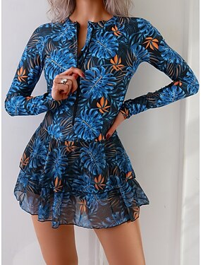 Per donna Costumi da bagno Tankini Due pezzi Shorts Costume da bagno Con zip Controllo della Pancia Vita alta Snello Vacanza Abbigliamento da Spiaggia Floreale Girocollo Senza Maniche Manica Lunga