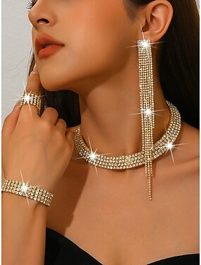 set di gioielli da donna con strass dorati: collana scintillante, orecchini, braccialetto &set di anelli per cocktail party, matrimoni ed eventi formali