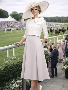 Due Pezzi Lunghezza alla caviglia Abito da invitata a nozze Abito da cerimonia per signora Manica 3/4 Collo gioiello Elegante Ospite di nozze Chiesa Raso Elasticizzato Gonne corte con Fiocco/Fiocchi