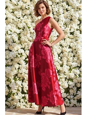 Linea ad A Lunghezza al pavimento Abito da invitata a nozze Abito Formale Abito da sera Abito da cerimonia per signora Senza Maniche Monospalla Elegante Formale Raso con Stampa