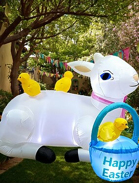 Decorazione gonfiabile pasquale con luci a led, 1,5 m/5 piedi, tre pulcini, cesto di fiori, cortile interno/esterno, giardino, prato, festa, atmosfera festosa, luci decorative, oggetti di scena