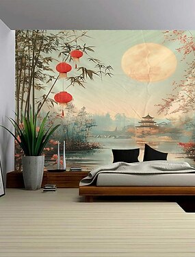 Arazzo digitale con stampa del lago lunare, fiori e alberi, paesaggio suggestivo, da appendere alla parete per camera da letto, soggiorno, dormitorio, decorazione per la casa.
