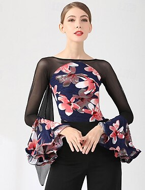 Top da ballo da sala da donna con maniche a campana, in rete trasparente, con fiori, per esercizi di valzer, tango e latino, blu navy