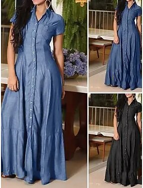 Per donna Abito lungo maxi Abiti di jeans Moda Moderno Quotidiano Vacanza Uscire Vestibilità regolare Semplice Manica Corta Colletto a Camicia Blu Nero Blu scuro Estate Primavera