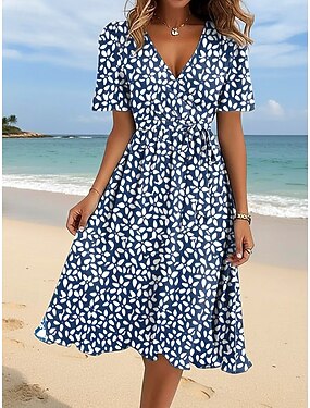 Per donna Abito Midi Abito a trapezio Vacanza Casual Ferie Data Vestibilità regolare Floreale Grafico Mezza Manica Scollo a V Blu Bianco Beige Estate Primavera Autunno Inverno