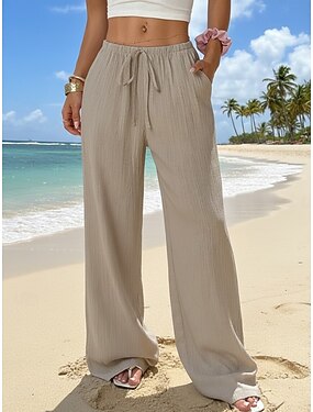 Pantaloni in cotone e lino da donna Pantaloni estivi Pantaloni larghi Pantaloni da spiaggia Elegante Vacanza Stile etnico Lunghezza intera Alta vita Con cordino Gamba larga Inelastica Spiaggia