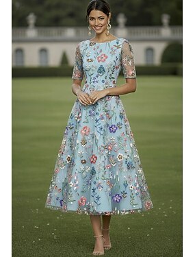 Linea ad A Lunghezza alla caviglia Lunghezza Tè Abito da invitata a nozze Largo Abito da cerimonia per signora Mezza Manica Scollo Illusione Scollo a Barca Scollo Tondo Elegante Vintage Formale