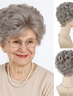 parrucche sintetiche corte grigie ricce per donne anziane, capelli grigio argento, taglio pixie a strati, parrucca con frangia, parrucche ondulate e soffici, festa in costume di Halloween per nonne di