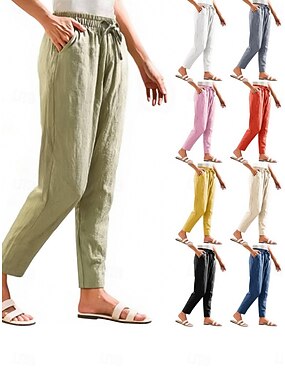Pantaloni donna in lino in misto cotone basi per vacanze lunghezza alla caviglia vita media comfort inelastici casual streetwear blu fiume blu navy bianco rosa estate primavera