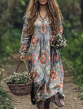 Per donna Abito lungo maxi Vestito Casual Abiti Boho Chic Abito Boho a Maniche Lunghe Abito Boho Elegante Bohemien Casual Quotidiano Spiaggia Vacanza Vestibilità regolare Floreale Manica Lunga Scollo