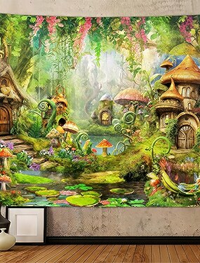 Arazzo da parete con casa dei funghi, giardino delle fate, foresta magica, paesaggio boschivo stravagante, arte murale per cameretta delle bambine, sala giochi, asilo nido, arredamento per la casa