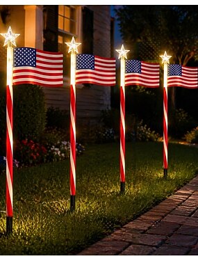 4 luci solari da vialetto a forma di bandiera americana, collegate in 1, con 8 modalità, decorazioni patriottiche a LED impermeabili rosse, bianche e blu per esterni, giardino, 4 luglio, Memorial Day.