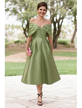 Linea ad A Lunghezza Tè Vestito da Festa Abito da Cocktail Abito da invitata a nozze Abito da cerimonia per signora Manica Corta Senza Spalle Elegante Formale Cocktail party Semi-Formale Raso con