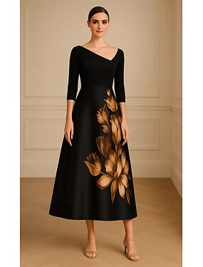 Linea ad A Lunghezza Tè Vestito da Festa Abito da Cocktail Abito da invitata a nozze Abito da cerimonia per signora Manica 3/4 Scollo a V Elegante Formale Ospite di nozze Ricevimento di matrimonio