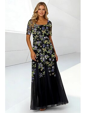Linea ad A Lunghezza al pavimento Perline ricamate Abito da invitata a nozze Abito Formale Abito da cerimonia per signora Manica Corta Collo quadrato Elegante Semplice Minimalista Formale Ospite di