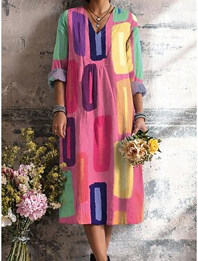 Per donna Abito al ginocchio Vestito Estivo Abito a trapezio Vacanza Casual Boho Spiaggia Feste Vestibilità comoda Grafico Geometrico Astratto Manica Lunga Scollo a V Rosa Viola Verde Cachi Estate